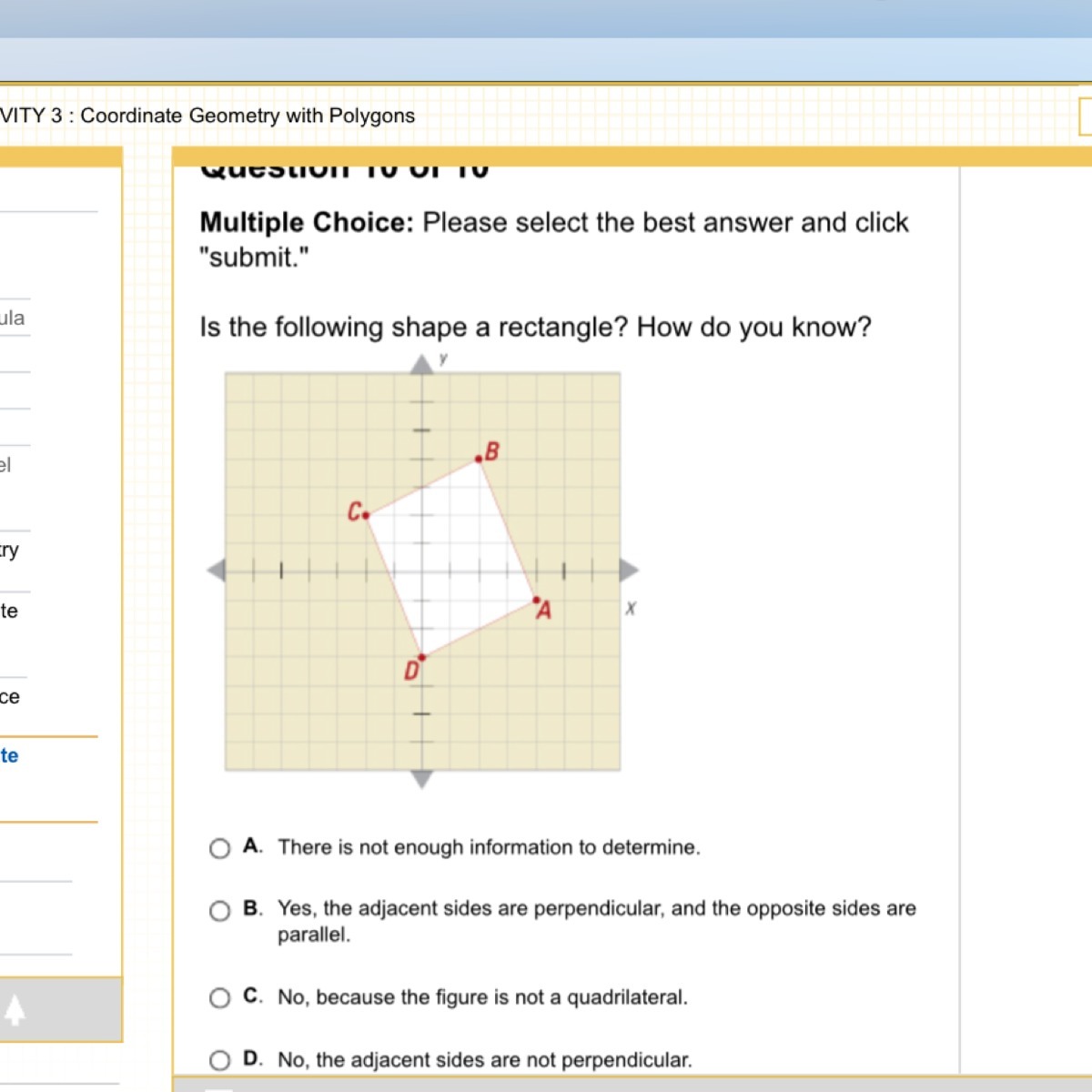 Answer: The answer is (D). No, the adjacent sides are not perpendicular.