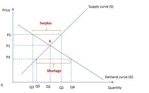 When the price is at P3, the quantity demanded (Q4) is larger than supplied (Q5), resulting in the shortage in the market.