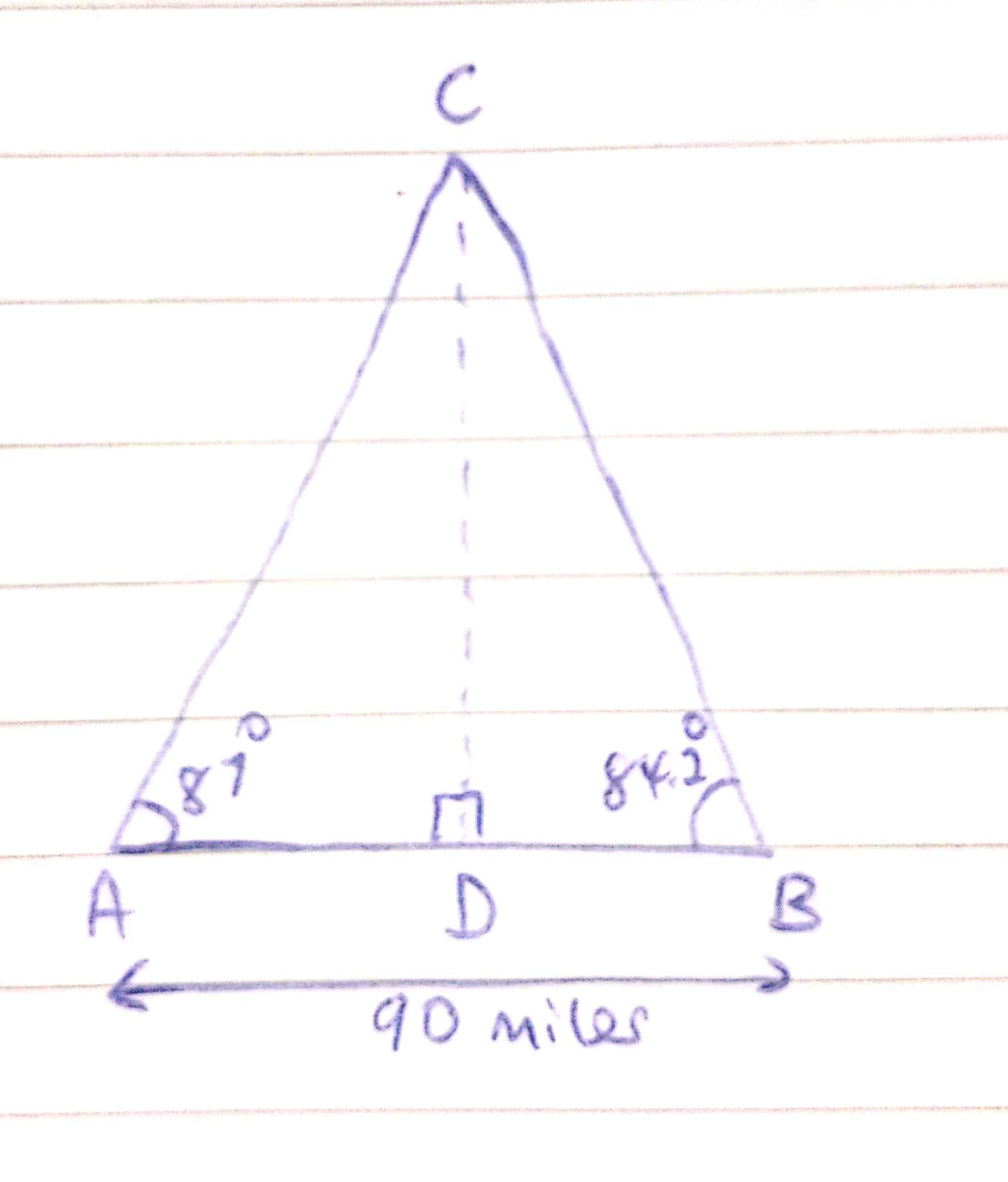 We are given the angles of elevation at A and B to be 87.0° and 84.2° respectively.