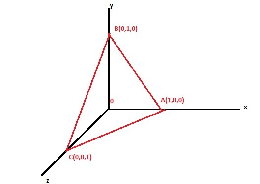 Let us understand this with the help of a diagram. Let there are three points in xyz-plane which are not colinear. The coordinates of points are A(1,0,0),B(0,1,0) and C(0,0,1). From the figure, we have