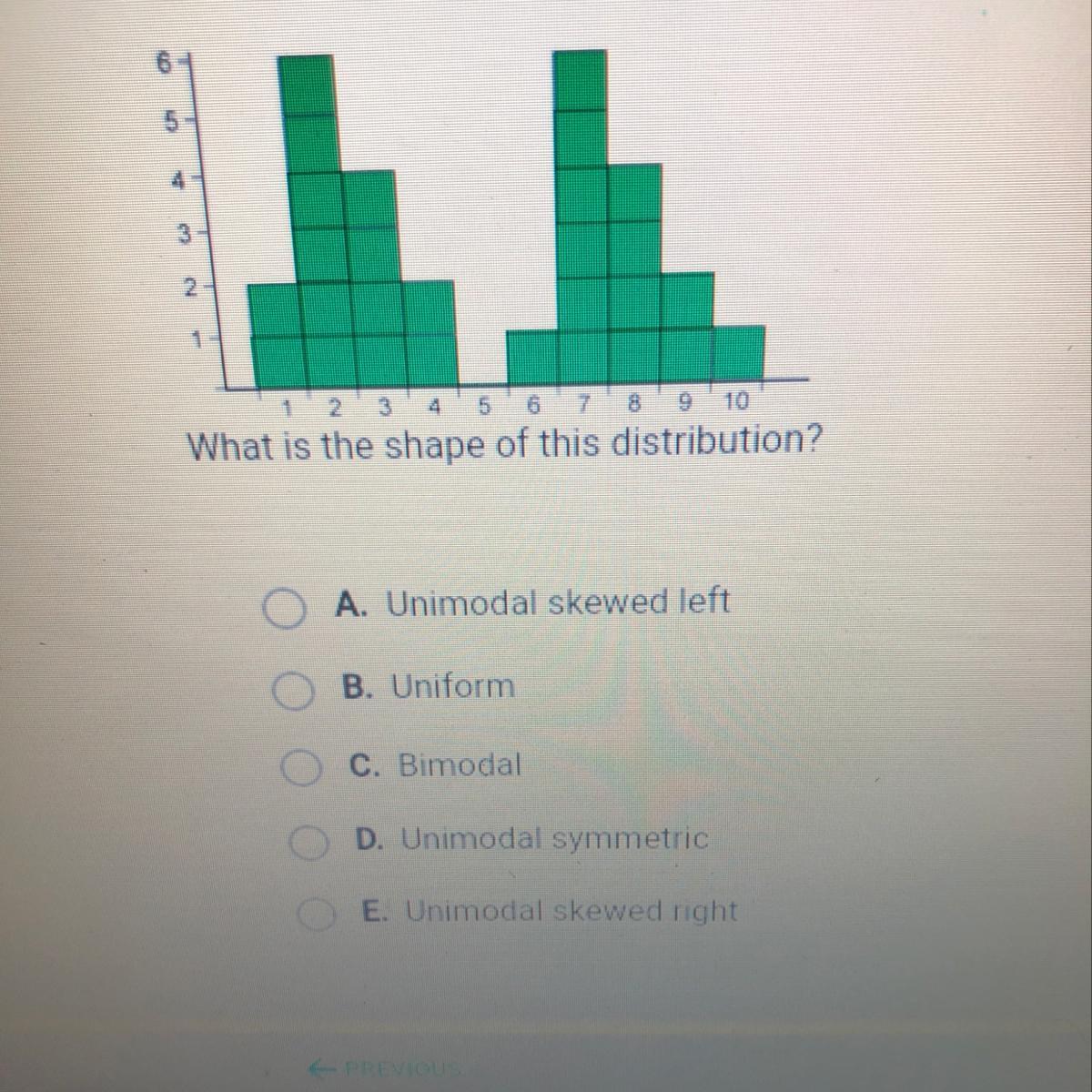 This histogram is unimodal skewed. There are two parts to this answer. The first part has to do with the number of modes. This would be the item that is occurring the most frequently. In this case the mode is only 4. It is occurring more than any other.