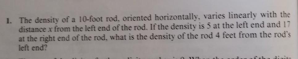 On one side of the rod the density is 5 and on the other the density is 17. The rod is ten feet long. So every 10 feet, the density increases by 17-5 which equals 12. We can simplify this and say that every five feet the density increases by six, because ten and twelve are both divisible by two, and this is a linear equation. So y=6/5x+5 where Y is the density of the tube and X is the distance from the left end of the tube. We add the +5 to the "x" side of the equation because at a distance of zero feet from the left end of the rod the density is already 5, and then goes up by 6/5x from there. So if you want to find the density four feet from the left side of the rod, you let x equal four. y=6/5(4)+5 and simplify.