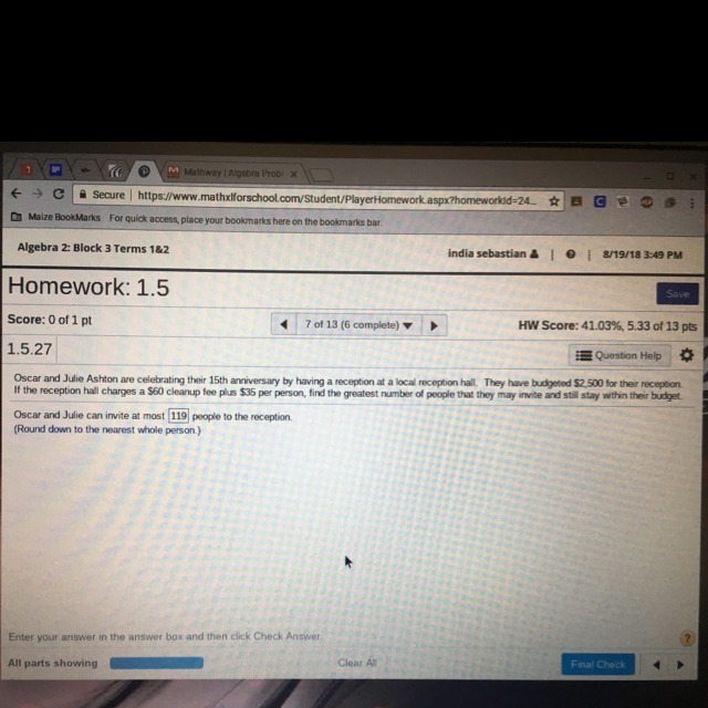 The reception hall charges a $60 cleanup fee plus $35 per person.