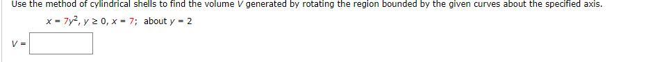When we revolve the region about y = 2, we get a cylindrical shape on its side. If we slice the shape into concentric shells, then each shell will have a radius of 2 − y, a thickness of dy, and a length of 7 − x. The volume of the shell is: