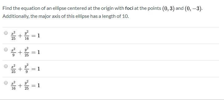 Now remember we have our foci at the point (0, ± 3). Our major axis length is 10, so if covers 5 units on either side of the x - axis. Therefore, c = 3, and a = 5. But remember that c is not part of an ellipse equation. Take a look at the formula below,