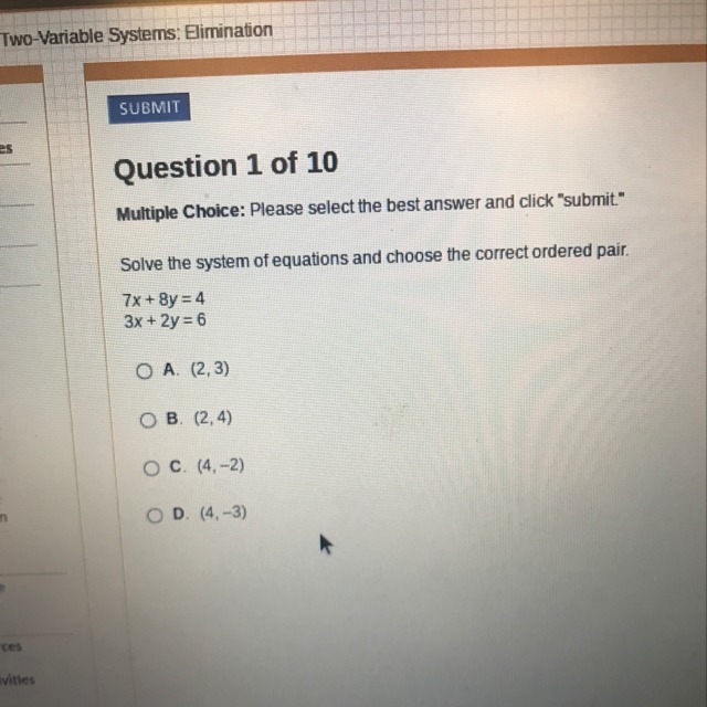You only need to find the value of y to select the correct answer, so if we're going to solve this system by elimination, we should choose to eliminate the x-variable.