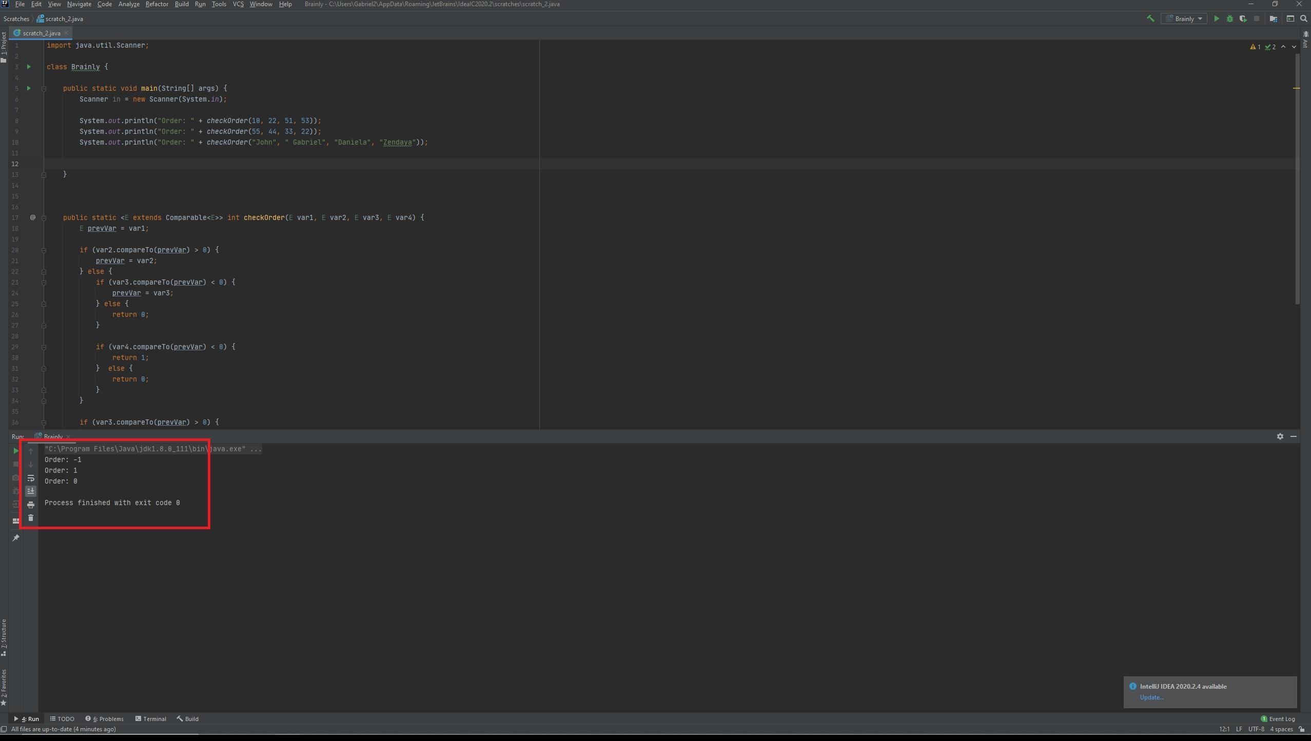 System.out.println("Order: " + checkOrder("John", " Gabriel", "Daniela", "Zendaya"));