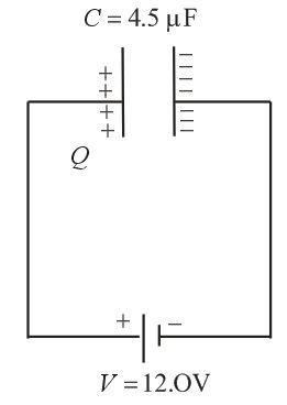 Capacitor, capacitance, 4.50 times 10^-6 F, 4.50 micro farad, 4.50 uF, 12.0 V, battery, magnitude, charge, plates, 54.0 times 10^-6 C, 54 times 10^-6 C, 54.0 micro coulomb, 54 micro coulombs, 54 uC, 54.0 uC.