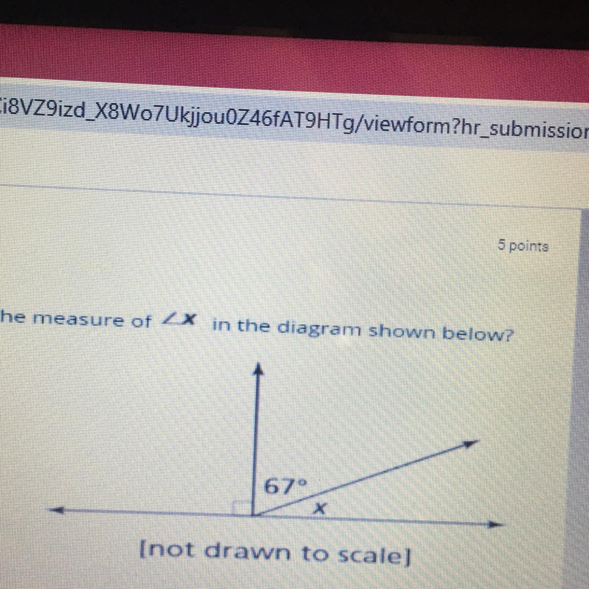 The shown angles are 90 and 67 degrees, and all together they should add up to 180 on a line.