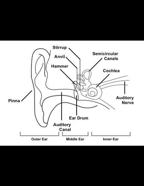 Sound waves from the source of sound are trapped by the <em><u>pinna</u></em><em><u> </u></em>and collected to the to the <em><u>auditory</u></em><em><u> </u></em><em><u>canal</u></em><em><u> </u></em>where they are concentrated to the middle ear consisting of the <em><u>ear</u></em><em><u> </u></em><em><u>drum</u></em><em><u> </u></em><em><u>(</u></em><em><u>stirrup</u></em><em><u>,</u></em><em><u> </u></em><em><u>anvil</u></em><em><u>,</u></em><em><u> </u></em><em><u>hammer</u></em><em><u>)</u></em><em><u>.</u></em><em><u> </u></em>Here the sound waves are amplified further to the<em><u> </u></em><em><u>semi-circular</u></em><em><u> </u></em><em><u>canal</u></em><em><u> </u></em>where these waves are converted to impulses and sent to the <em><u>brain</u></em> via the <em><u>auditory</u></em><em><u> </u></em><em><u>nerve</u></em> for interpretation