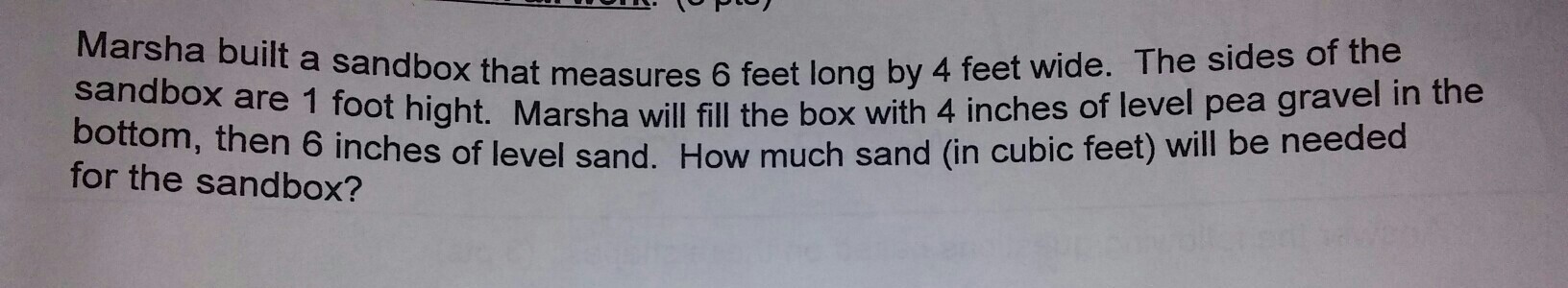 For this, it's like finding a partial volume. Altogether, there will be 10 inches of sand, because 4+6 is 10. Because it is in inches, we have to convert it to feet. 10 inches in feet is 10/12 feet, or about .833. This is then used for the volume formula instead of the 1 foot height. So, the equation is 6 times 4 times 10/12. This comes out to be 20. Hope this helps :)