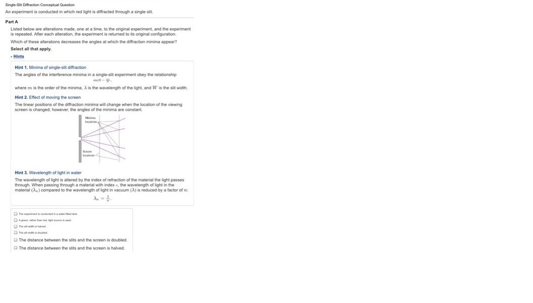 <span>B it seems to be</span> irrelevant, as changing the distance to the screen will not affect the distance between the diffraction angle of minima, it will only change its width;