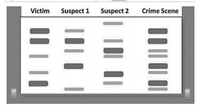 electrophoresis, which shows DNA fragments of the victim and two suspects,