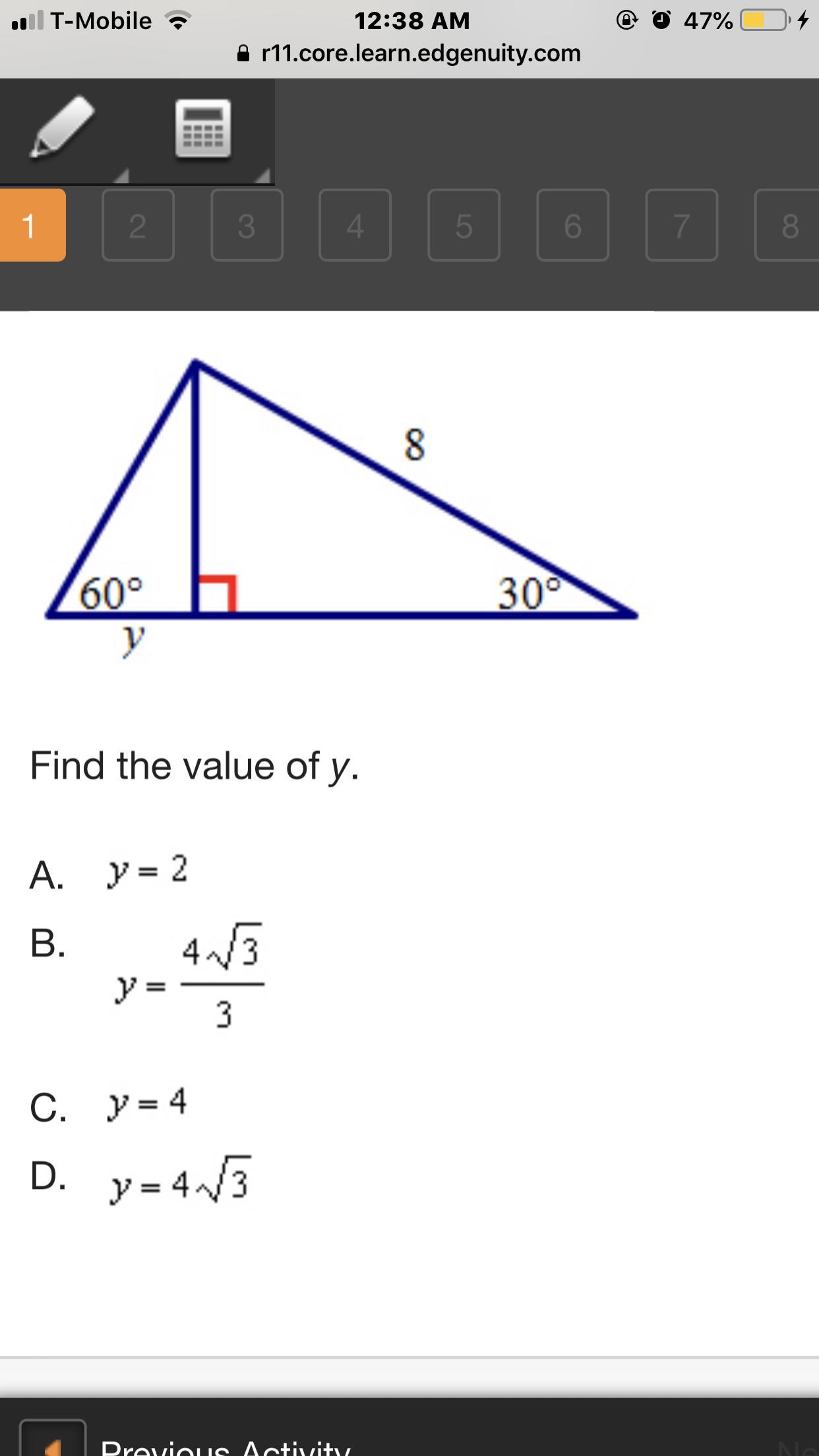 y : 4 : hypotenuse = 1 : √3 : 2
