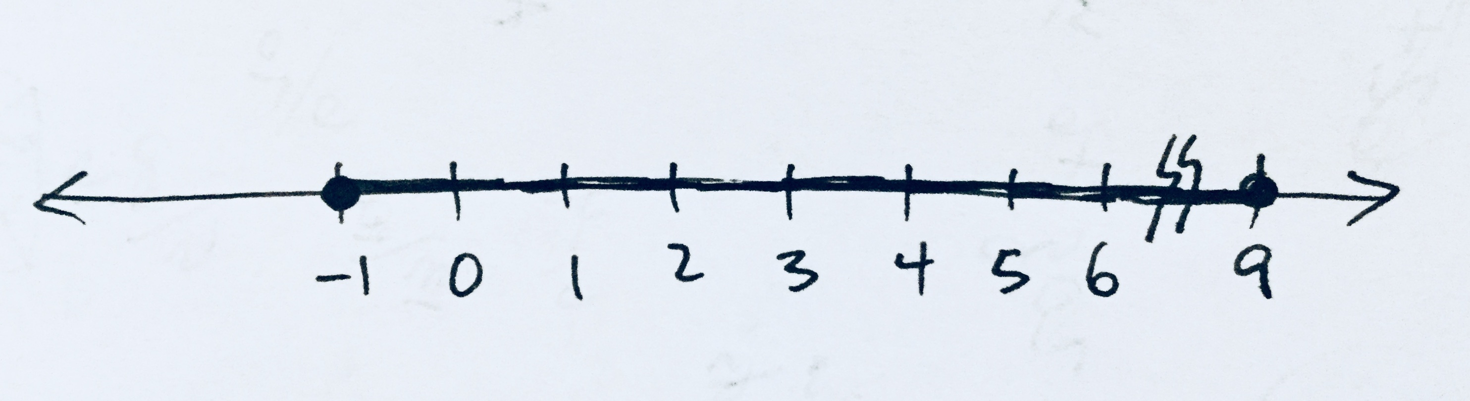 A conventional number line has more positive (greater) numbers on the right. It can be marked any way that is convenient for your problem. In the one shown here, there was a bit of a "plan ahead" issue, as I ran out of space before I got to the 9 at the end of your interval. That is why the break symbol (∥) is there.