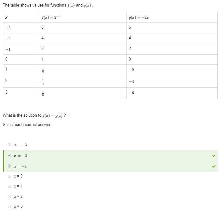 So, according to the table, x = -2, and x = -1 are solutions to f(x) = g(x)