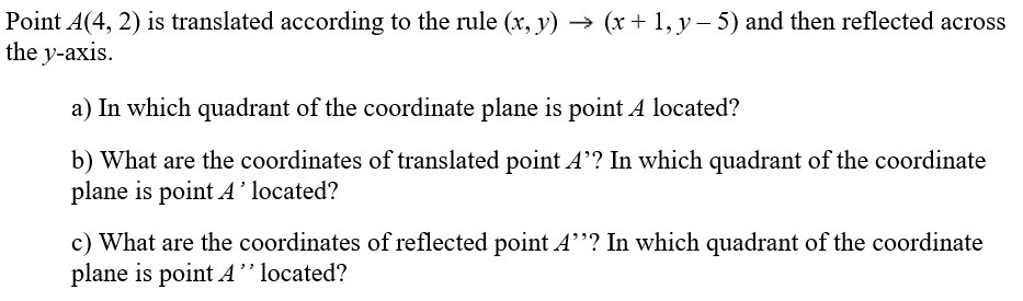 Your answer would be, Point A(4, 2) is translated according to the rule (x, y) ==> (x + 1, y - 5), and then reflected across the Y- Axis.