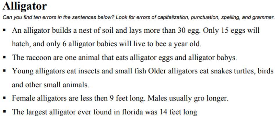Second sentence errors: It should be "Raccoons are a type of animal that eat alligator eggs and alligator babies"