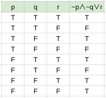 We take ~p∧~q∨r to mean (~p∧~q)∨r because "and" normally has precedence over "or." The (~p∧~q) term will only come into play when both p and q are false. It will only affect the outcome if r is also false. This condition is the last line of the table.