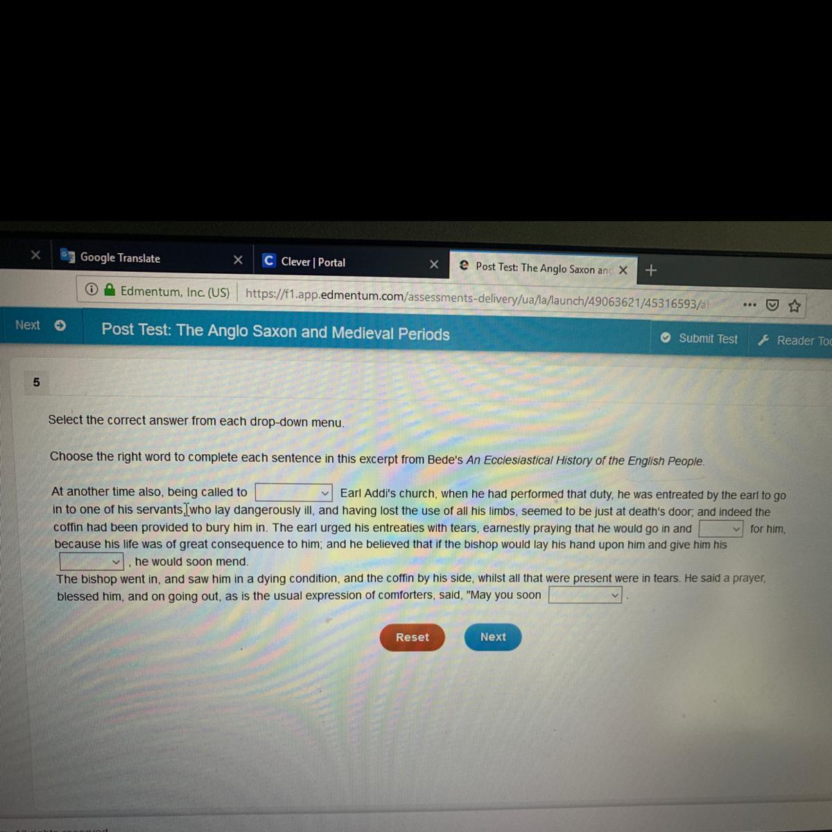 AT another time also, being called to consecrate the church of a thegn named Addi, when he had performed the required duty, he was entreated by the thegn to go in to one of his servants, who lay dangerously ill, insomuch that having lost all use of his limbs, he seemed to be at the point of death; and moreover the coffin had been made ready wherein to bury him after his death. The thegn urged his entreaties with tears, earnestly beseeching him that he would go in and pray for the servant, because his life was of great moment to him; and he believed that if the bishop would lay his hand upon him and give him his blessing, he would soon mend. So the bishop went in, and saw him very near death, and by his side the coffin in which he was to be laid for his burial, whilst all mourned. He said a prayer and blessed him, and going out, spake the wonted words of comfort, "Good health be yours and that speedily." Afterwards, when they were sitting at table, the servant sent to his lord, desiring that he would let him have a cup of wine, because he was thirsty. The thegn, rejoicing greatly that he could drink, sent him a cup of wine, blessed by the bishop; and, as soon as he had drunk it, he immediately got up, and, shaking off the heaviness of his infirmity, dressed himself and went forth, and going in to the bishop, saluted him and the other guests, saying that he also would gladly eat and drink with them. They bade him sit down with them at table, greatly rejoicing at his recovery. He sat down, ate and drank and made merry, and behaved himself like the rest of the company; and living many years after, continued in the same health which he had gained. The aforesaid abbot says this miracle was not wrought in his presence, but that he had it from those who were present.