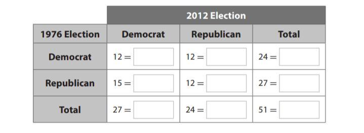 In the frequency data table attached, we see that the joint frequency count for Democrat winning in 1976 and 2012 is given as 12.