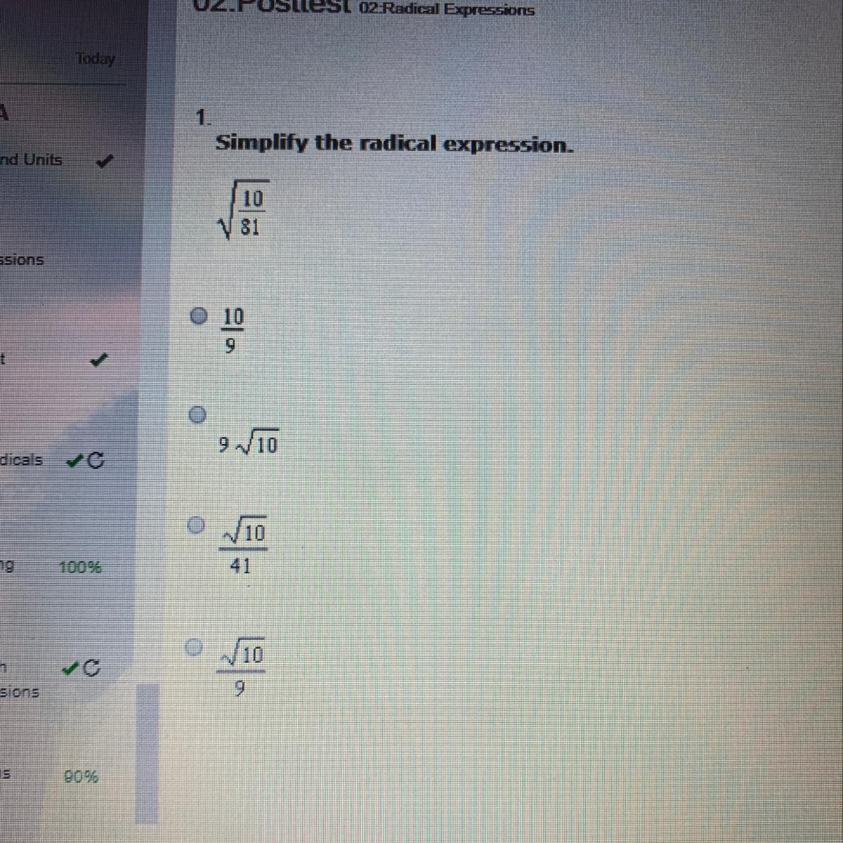 \frac{\sqrt{10} }{\sqrt{81} }=\frac{\sqrt{10} }{9}