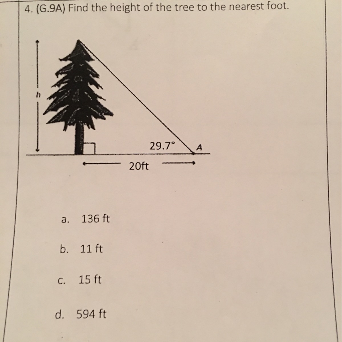 Looking at the triangle, we see that the angle 29.7 deg and the "adjacent side" length 20 ft are given. Our job is to find the "opposite side," which is the height of the tree.