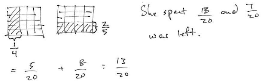 Nadia spent 1/4 of her money on a shirt and 2/5 on new shoes. What fraction of Nadia's money has been spent? What fraction of he