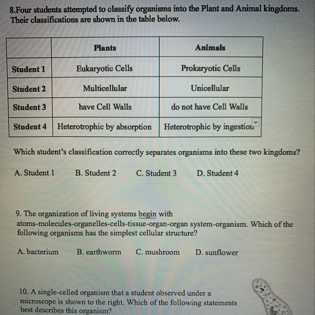 Student 3 correctly separate organisms into these 2 kingdoms