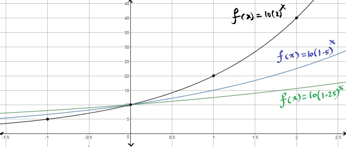 . The attached figure shows few graphs of exponential function whose b value is less than 2 and greater than 1. We can notice that graph increases at slower rate, that is change in y with respect to change in x is getting slower as we reduce the values of b less than 2 and greater than 1.