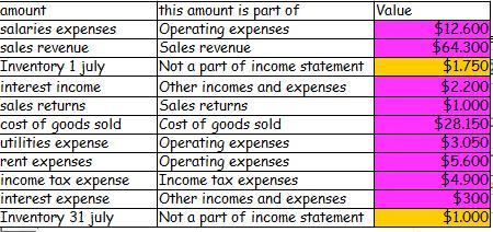 First, we have to recognize every amount in the income statement. We classify everyone there, except the initial and final inventory because these amounts are part of the financial position statement (see attachment)