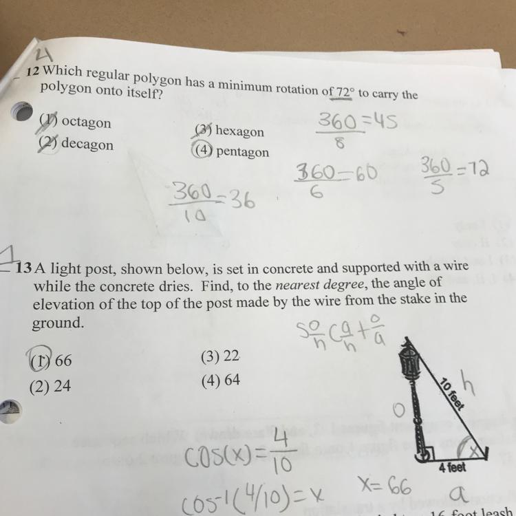 As far as I can see, you have both 12 and 13 correct. The short way to do 12 is just to divide 72 into 360