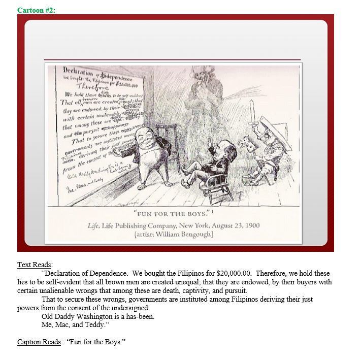 2. The cartoon has been drawn as a reaction to the Spanish-American War and the acquisition of the Philippines for $20 million. America bought the Philippines from Spain against their will, which is why the author has changed the words of the Declaration.