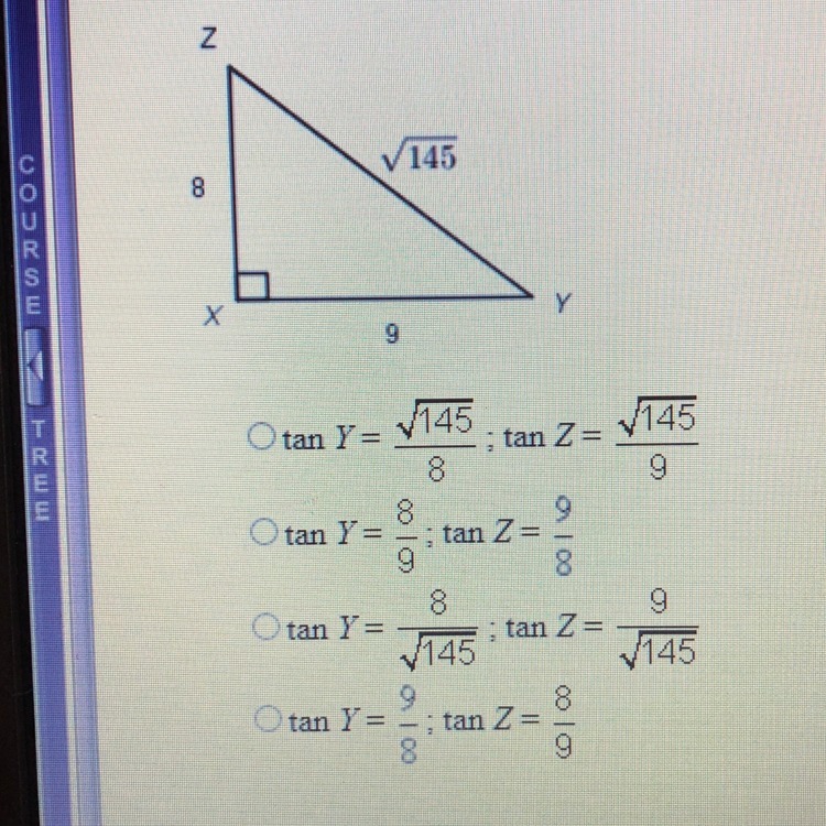 For\ Y\\\\opposite=8\\adjacent=9\\\\therefore\ \tan Y=\dfrac{8}{9}\\\\For\ Z\\\\opposite=9\\adjacent=8\\\\therefore\ \tan Z=\dfrac{9}{8}
