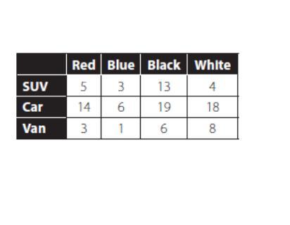 An attendant recorded the data in the table showing the types and colors of vehicles that parked in a parking lot. (Refer to the