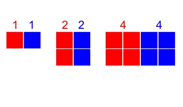 4:4 is equivalent to 1:1. As in the previous statement the ratio is also 1 red square to 1 blue square, even though there are four red squares and four blue squares as illustrated in the Figure.