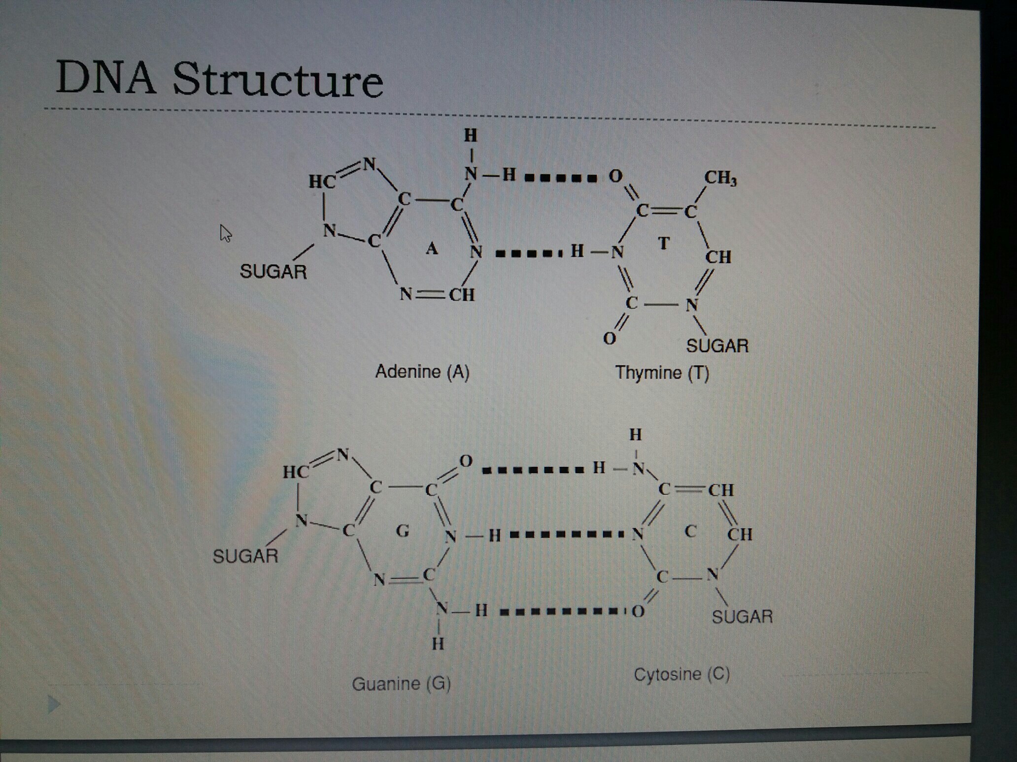 Adenine(A) Thymine(T) Guanine(G) Cytosine(C)