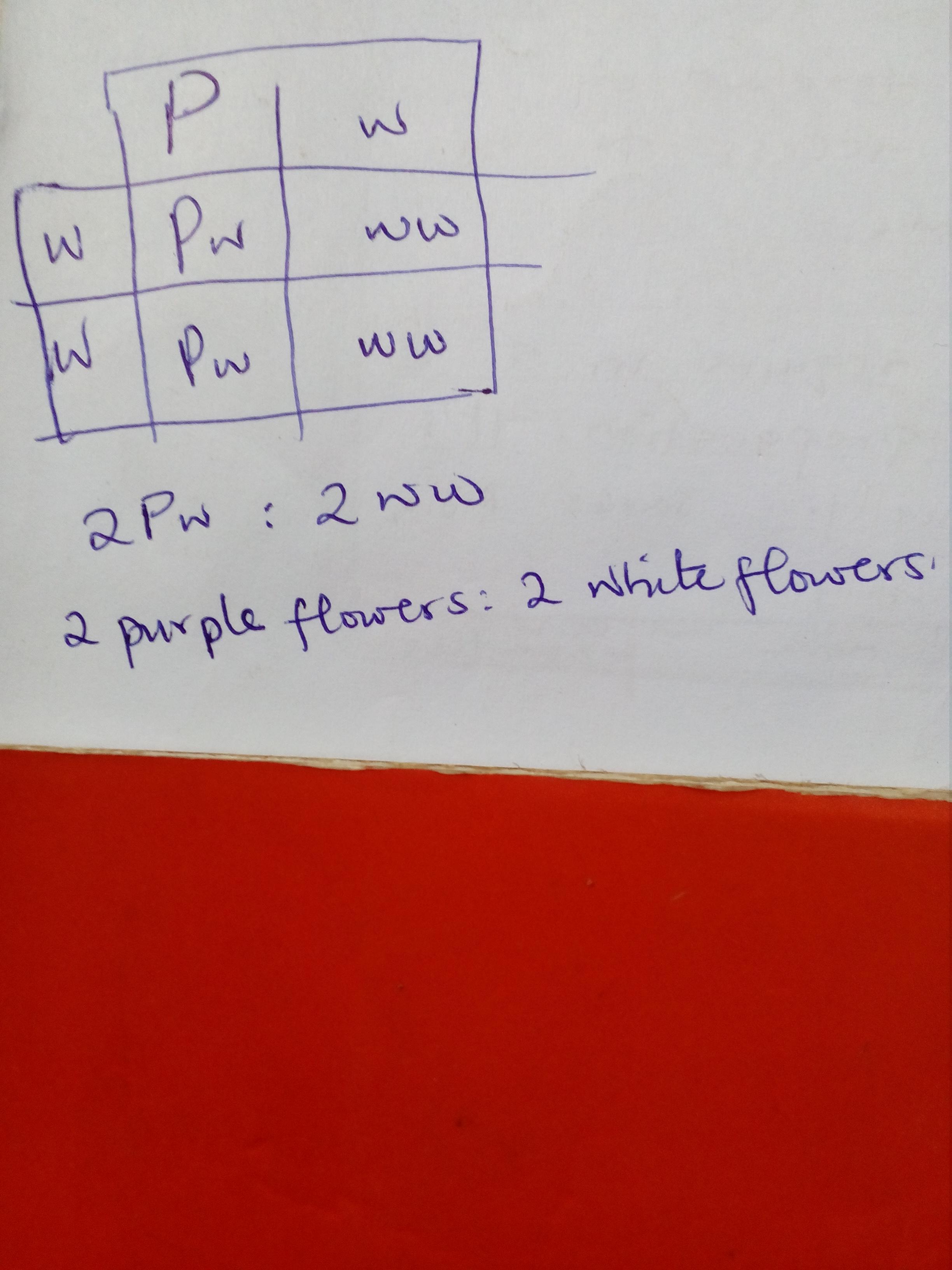 Explanation: Purple flower is dominant over white flower, therefore a cross between Pw and ww will produce four offsprings, fifty percent of which will have purple flowers and the other fifty percent will have white flowers. The genotypes of the offsprings are Pw and ww. Pw will manifest outwardly as purple flowers while ww will manifest outwardly as white flowers.