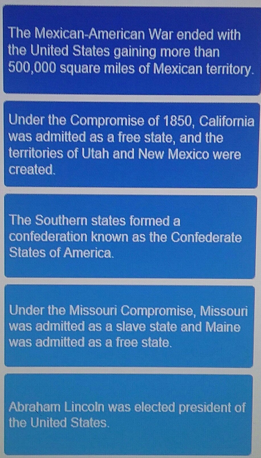SEPTEMBER, 1850: Under the Compromise of 1850, California was admitted as a free state, and the territories of Utah and New Mexico were created.