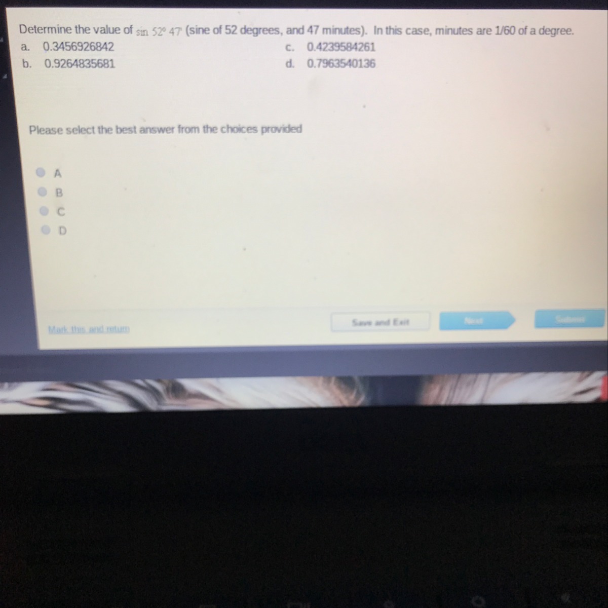 sin 52.7833 = 0.796354