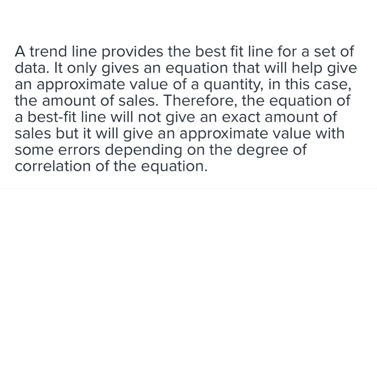 A trend line shows the relationship between the two variables in the scatterplot. It can be used to predict based on the relationship, but it cannot be expected to produce exact figures.