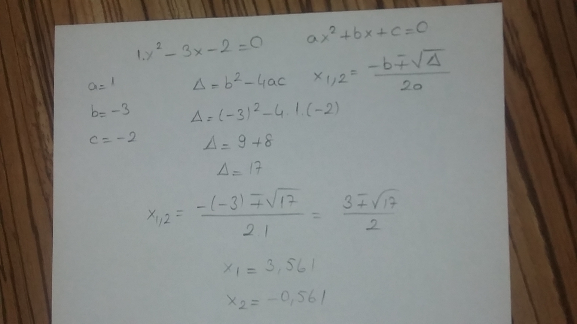 What are the values of a, b, and c in the quadratic equation 0 = x2 – 3x – 2?
