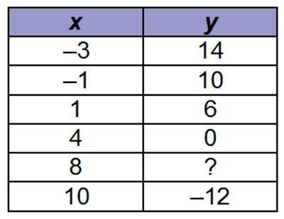 beled x with entries negative 3, negative 1, 1, 4, 8, 10. The second column is labeled y with entries 14, 10, 6, 0, question mark, negative 12. –20 –8 8 48 I need this quick;-;