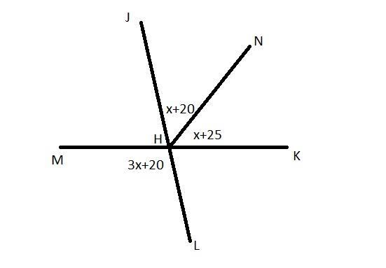 Given information: ∠MHL=(3x+20), ∠KHN=(x+25), and ∠JHN=(x+20).