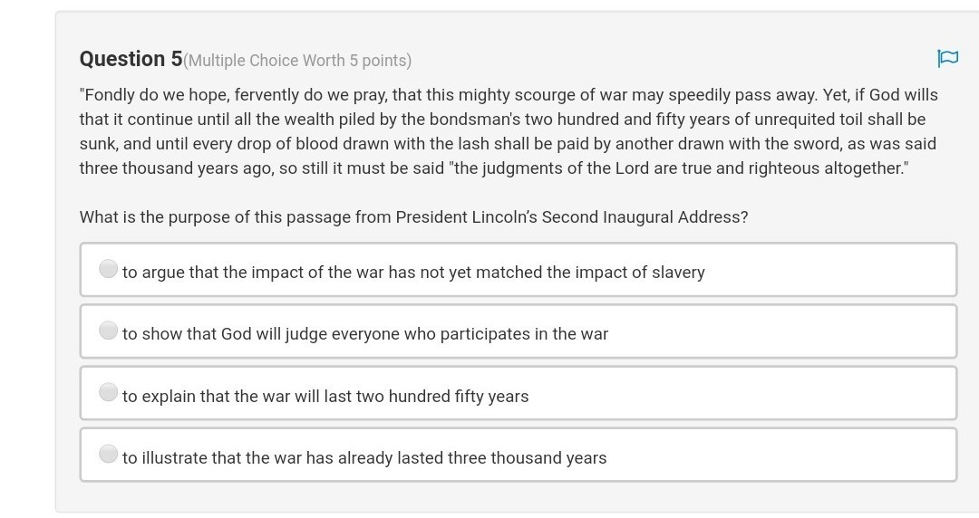 t it continue until all the wealth piled by the bondsman's two hundred and fifty years of unrequited toil shall be sunk, and until every drop of blood drawn with the lash shall be paid by another drawn with the sword, as was said three thousand years ago, so still it must be said "the judgments of the Lord are true and righteous altogether." What is the purpose of this passage from President Lincoln’s Second Inaugural Address?
