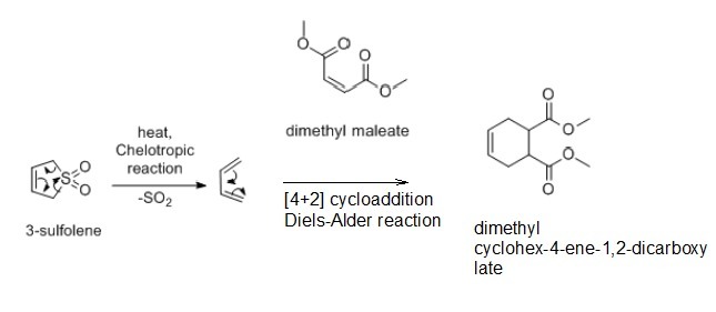 On heating 3-sulfolene the compound breaks down to give sulfur dioxide gas and butadiene. This diene then reacts with dimethyl maleate which acts as a dienophiles and then these two diene and dienophiles will undergo a Diels-Alder reaction to form a new 6-membered cyclohexene ring.