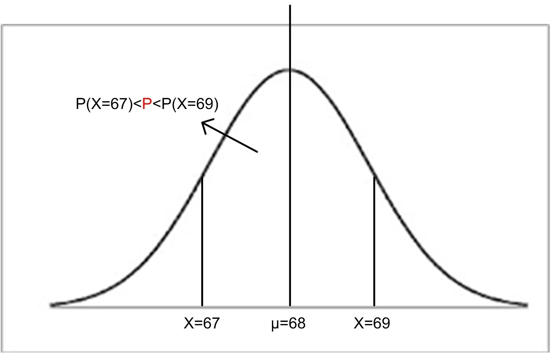 The bell curve below shows the location of the mean and the two values of X; 67 and 69