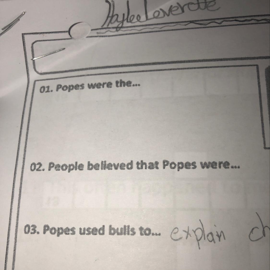 #1) Popes were and still are the main preast of the catholic church, in older times they were very famous for causing alot of politcal problems and some kings like King Henry the VI even broke away from him to divorce a wife which caused major problems in the political and religion era at the time that later effected future culture everywhere in the world. To conclude, popes are pretty important.