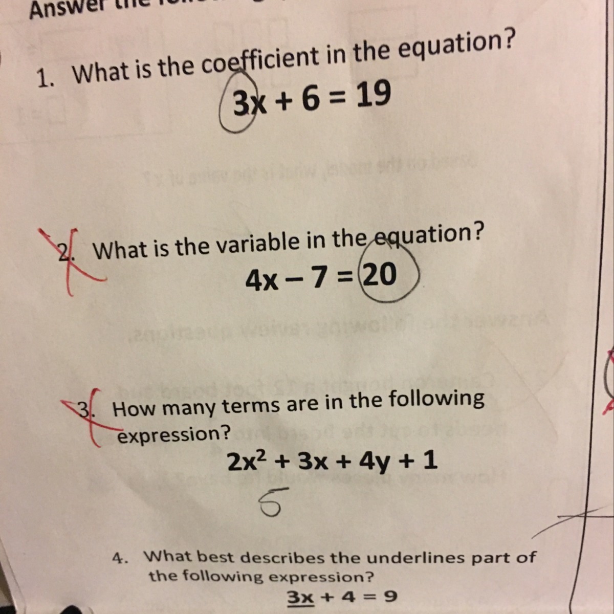 Okay, so, for #2, you needed to circle "x" for your answer. "X" is a variable, not a term. Any letter used in an equation or expression is a variable.