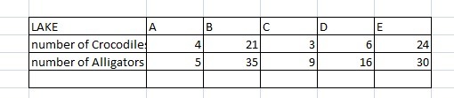 The table below shows the given data of each lake and number of crocodiles and alligators in each lake.